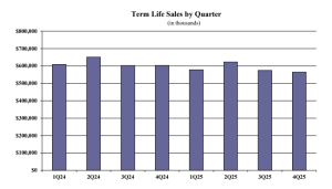 Term life fourth quarter sales were $565.2 million; down 1.6% when compared with the previous quarter and down 6.4% compared to the same period last year. Total 2025 term life sales were $2.3 billion.